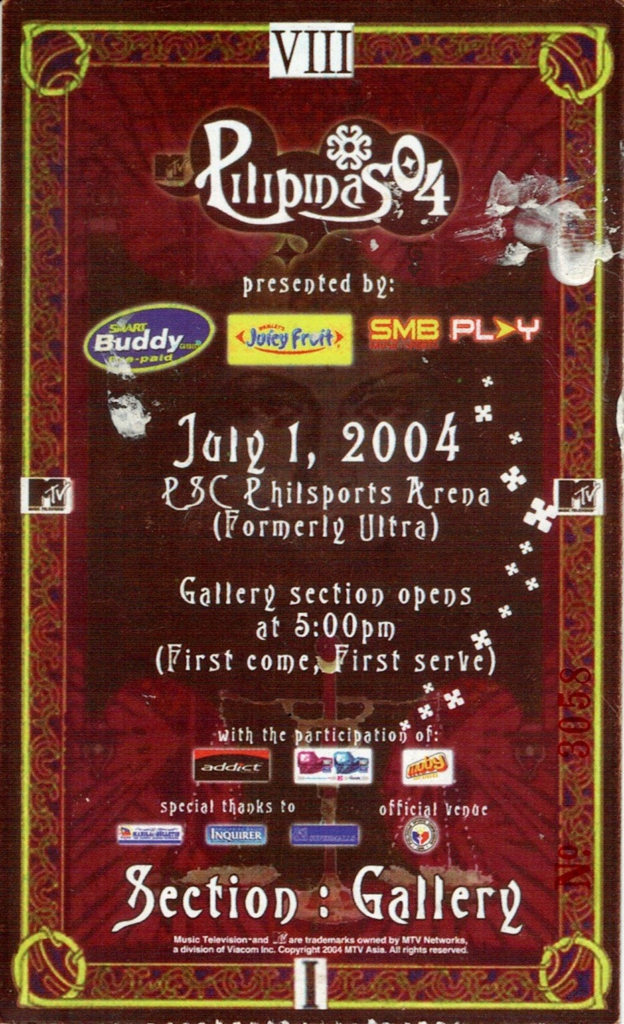 He slapped the ticket into my palm before I could say anything. I slowly handed him the money on autopilot, while trying to process what I was doing. I wasn’t haggling – I hadn’t even intended to go. I stared at the red card in my hand, slowly recalibrating my plans for the next few hours. I didn’t know the actual cost or value of the ticket in my hand, but I was now in possession of an MTV Pilipinas Music Awards 2004 entrance ticket, for the price of a few sticks of fishballs. Well, this is a first for me, buying a ticket from a scalper.